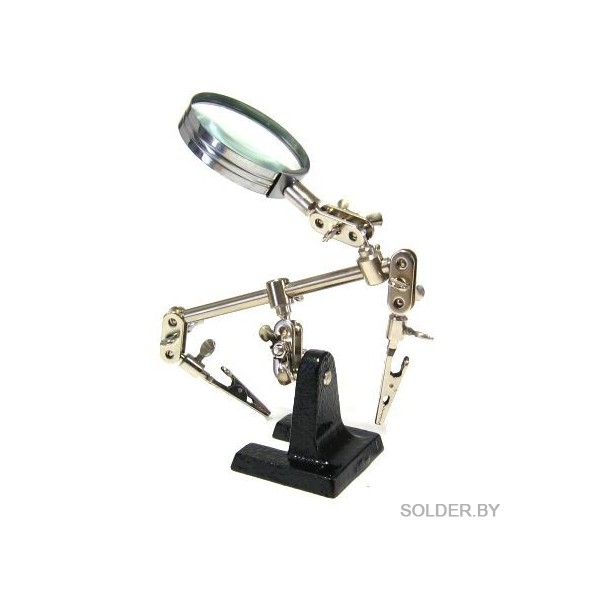 Держатель "третья рука" с лупой применяется для проведения паяльно-сборочных работ в электронике, ювелирном деле, сборке и ремонте для зажима мелких деталей в любом нужном положении, когда не хватает двух рук. Инструмент состоит из чугунного основания (тяжелая подставка), шарнирного соединения с зажимами типа «крокодил» (подвижных во всех плоскостях) с никелевым покрытием и лупы с 3-х кратным увеличением (возможность регулировки положения, диаметр линзы 60мм). С помощью лупы можно будет рассмотреть даже самые мелкие детали.