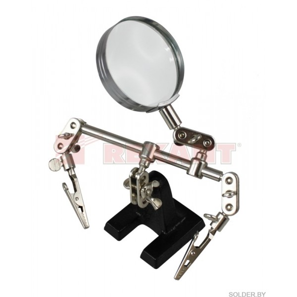 Держатель "третья рука" с лупой х2.5 HT-390 (ZD-10R) REXANT служит главным образом при проведении паяльно-сборочных работ в электронике, ювелирном деле, сборке и ремонте для зажима мелких деталей в любом нужном положении, когда не хватает двух рук. Инструмент состоит из чугунного основания (тяжелая подставка), шарнирного соединения с зажимами типа «крокодил» (подвижных во всех плоскостях) с никелевым покрытием и лупы с 2.5 кратным увеличением (возможность регулировки положения, диаметр линзы 60мм). С помощью лупы можно будет рассмотреть даже самые мелкие детали.