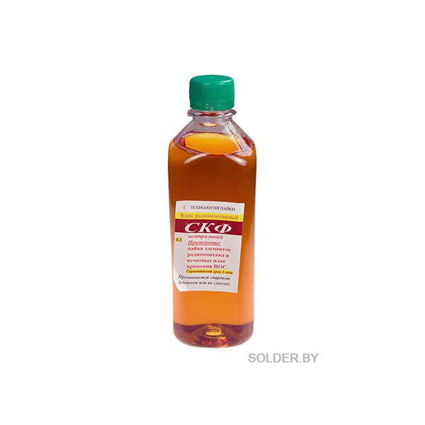 Спиртоканифольный флюс СКФ (жидкая канифоль) относится к нейтральным флюсам и не требует отмывки остатков. Остатки флюса после пайки не вызывают коррозии металлов и не проводят электрический ток. Флюс СКФ широко применяется в электро- и радиомонтажных работах легкоплавкими припоями.