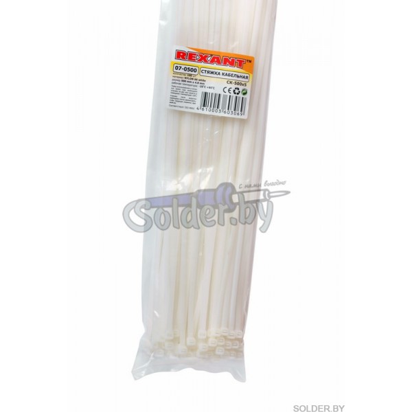 Хомут nylon 5.0 х 500 мм 100 шт белый REXANT арт. 07-0500