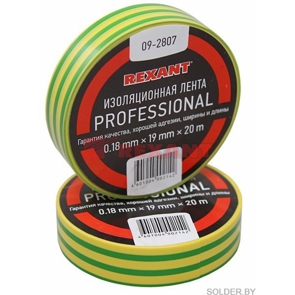 Изолента профессиональная 0.18 х 19 мм х 20м желто-зеленая REXANT арт. 09-2807