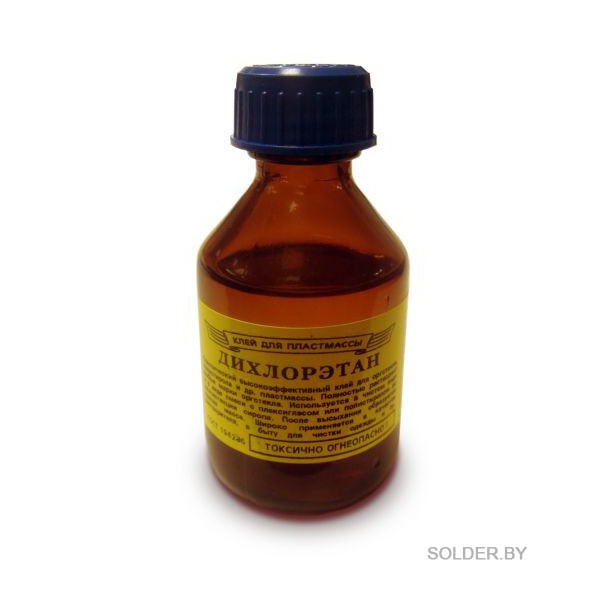 Прозрачная ядовитая жидкость.Чтобы дихлорэтан стал клеем, в нем необходимо растворить 10% полистирола или 2% оргстекла. Предназначен для склеивания корпусной пластмассы из полистирола и оргстекла. Не применять для склеивания пищевой посуды.