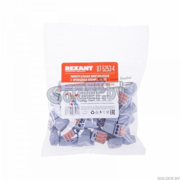 Соединительная многоразовая клемма REXANT на 3 проводника с плоско-пружинным зажимом предназначена для подсоединения медных одножильных и многожильных зачищенных проводников тонкого сечения.