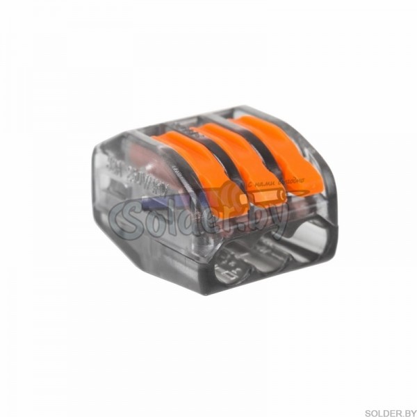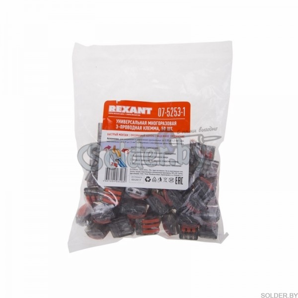 Соединительная многоразовая клемма REXANT на 3 проводника с плоско-пружинным зажимом предназначена для подсоединения медных одножильных и многожильных зачищенных проводников тонкого сечения.