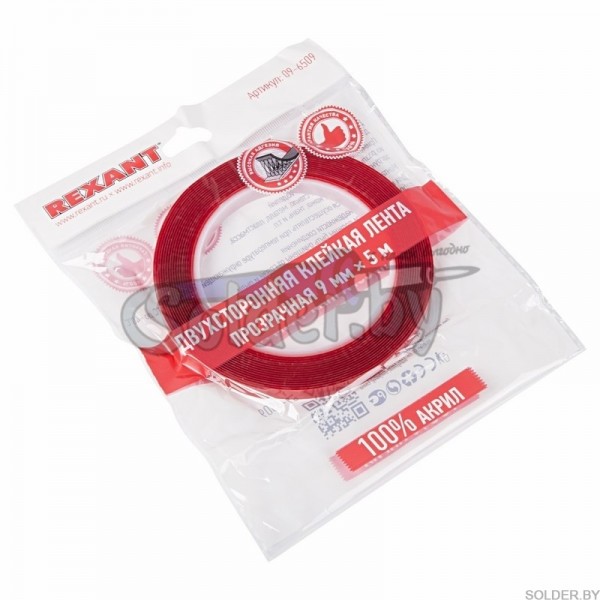 Двухсторонний скотч прозрачный 9мм 5м REXANT арт. 09-6509