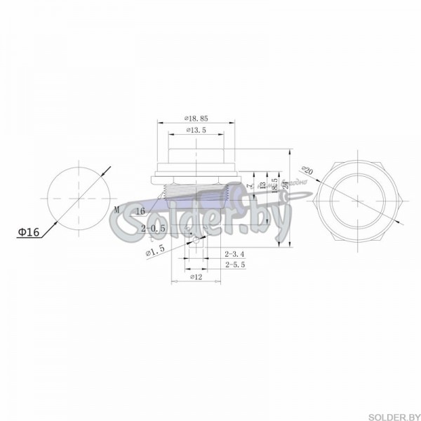 Выключатель-кнопка металл 250V 3А (2с) (ON)-OFF Ø16.2 черная предназначена для коммутации электрических цепей переменного тока напряжением до 250В путем включения-выключения питающего провода.