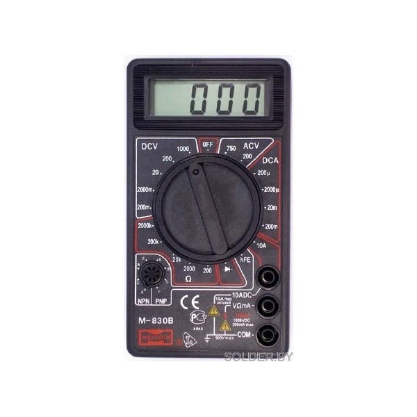 Мультиметр измеряет постоянный и переменный ток, постоянное и переменное напряжения, сопротивление и коэффициент усиления биполярных транзисторов (h21). Так же с помощью прибора можно прозванивать полупроводниковые диоды.