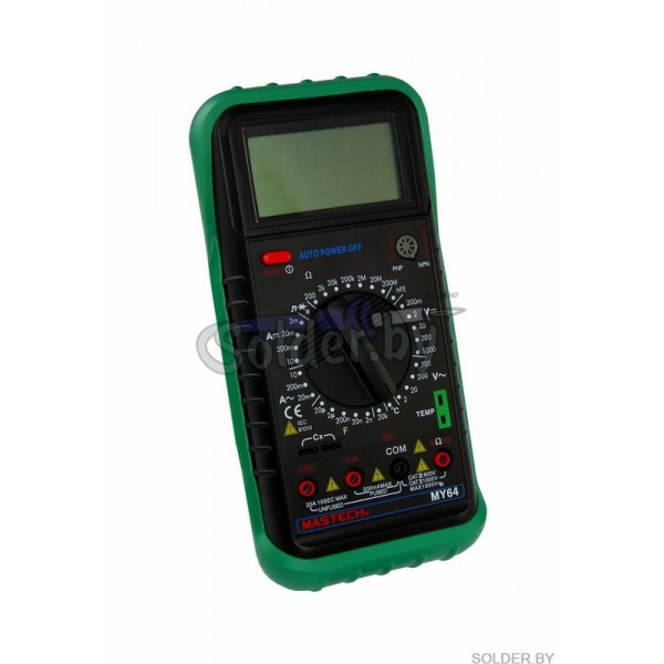 Все приборы серии MY64 измеряют постоянное и переменное напряжение, постоянный и переменный ток, сопротивление в цепи, емкость, температуру и даже частоту. А так же с помощью данного прибора можно проводить тестирование диодов, прозвонку целостности цепи и измерение коэффициента усиления транзисторов.