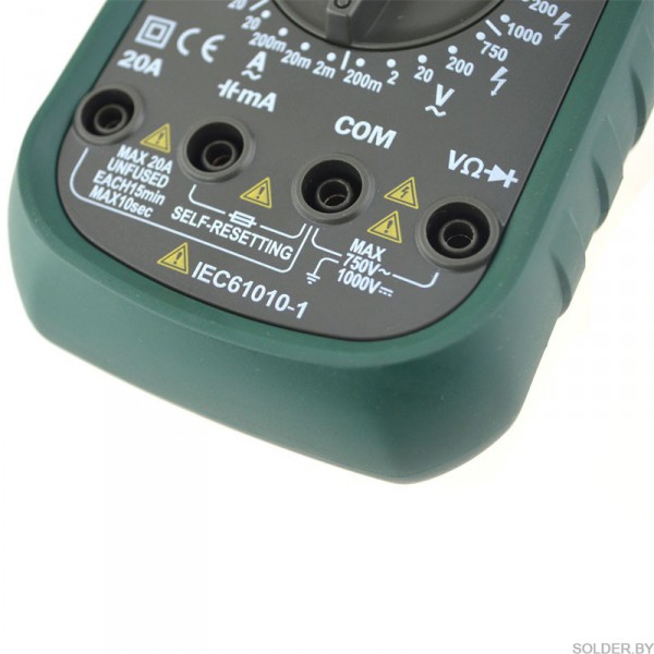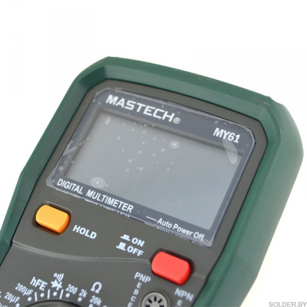 Универсальный цифровой мультиметр Mastech МY61 позволяет измерять силу тока, постоянное/переменное напряжение, емкость конденсаторов, частоту, сопротивление, коэффициент усиления биополярных транзисторов. Чтобы выбрать пределы измерения величин, достаточно установить нужное положение многопозиционного переключателя.
