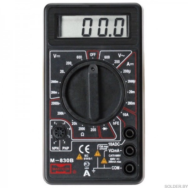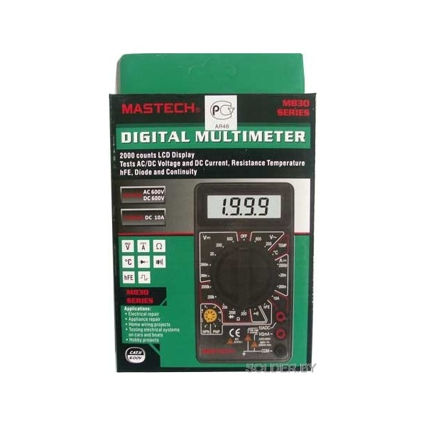 Мультиметр цифровой MASTECH M830B Цифровой мультиметр Mastech M830B производит измерения силы постоянного и переменного тока, величины постоянного и переменного напряжения, сопротивления и коэффициент усиления биполярных транзисторов (h21).