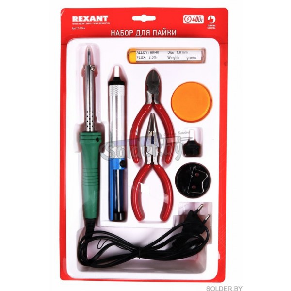 Набор для пайки №13 (паяльник 40Вт, подставка, губка для удаления припоя, канифоль, припой) REXANT а