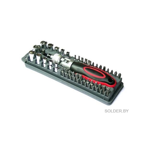 Удобный набор "все-в-одном", состоящий из 40 элементов. Рукоятка-трещотка со сменным углом наклона ручки. Материал насадок - хромованадиевая сталь.