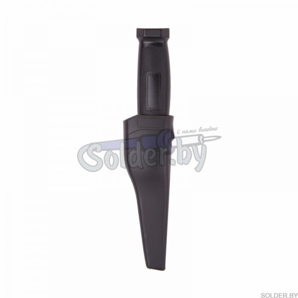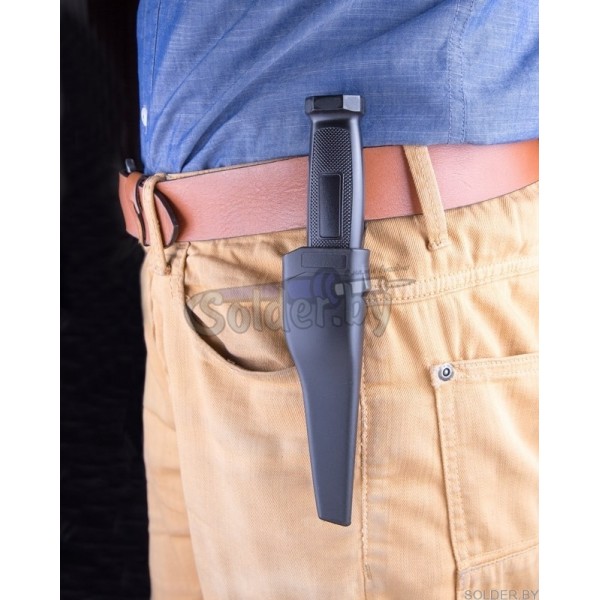 Нож идет в комплекте с пластиковым чехлом, который удобно крепить к одежде.