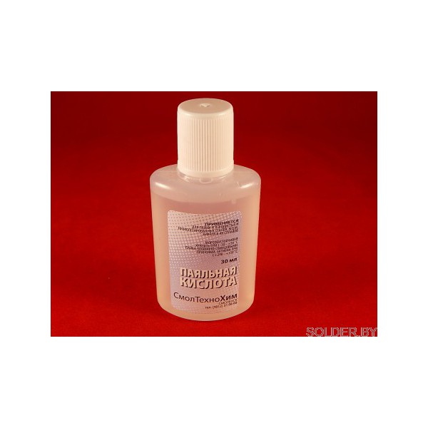 Кислота паяльная 30 мл. (СмолТехноХим) - паяльная кислота представляет собой раствор кислоты и цинка в различных пропорциях, применяется для снятия различных окисей с поверхностей металлов и проводов, представляющих в дальнейшем более крепкое и устойчивое соединение в местах самой пайки оловом.