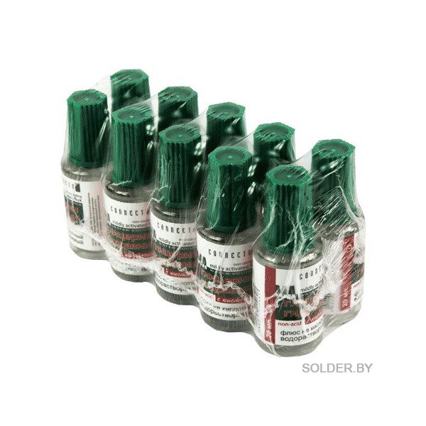Самый активный флюс, для которого, хоть и с большими оговорками, допускается пайка печатных плат. Закисшие детали, изъеденные коррозией контакты, не представляют никаких проблем для этого флюса. Не смотря на высочайшее качество паек и скорость на грани физических возможностей пайки, не следует употреблять этот флюс для пайки печатных плат, если Вы не планируете качественную отмывку остатков флюса. Промывка водой, желательно горячей.