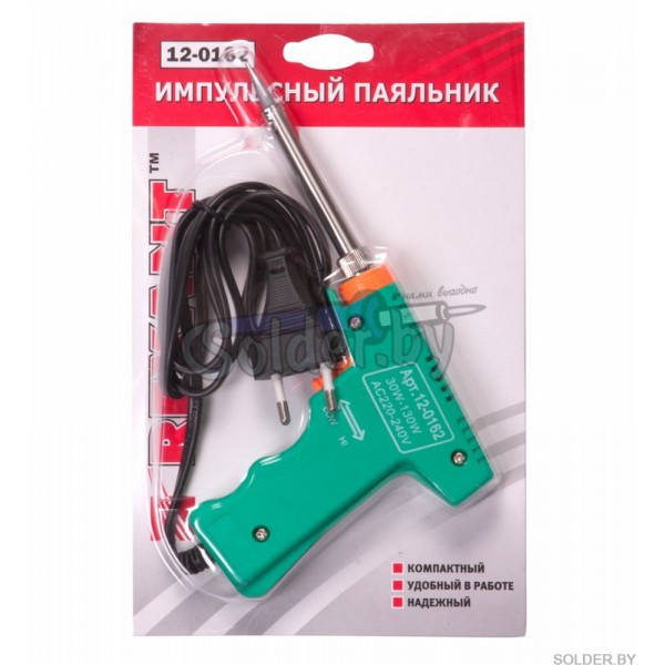 Паяльник импульсный 30-130 Вт HS-50 (ZD-80) REXANT предназначен для ручного монтажа радиоэлементов. Он используется для пайки электродеталей в двух мощностных режимах: 30 Вт и 130 Вт. Особенность данного инструмента заключается в том, что максимальная мощность и ускоренный разогрев активируются нажатием и удержанием курка. Это позволяет оператору сначала установить жало инструмента в определенную точку пайки, а затем нажатием кнопки на корпусе перевести паяльник в максимальный рабочий режим. Паяльник выполнен в форме пистолета с индикатором включения и имеет очень удобную эргономичную рукоятку из ударопрочного пластика. Характеризуется экономичным энергопотреблением. Удобен для распайки кабелей в шкафах, а также быстрых демонтажных работ.