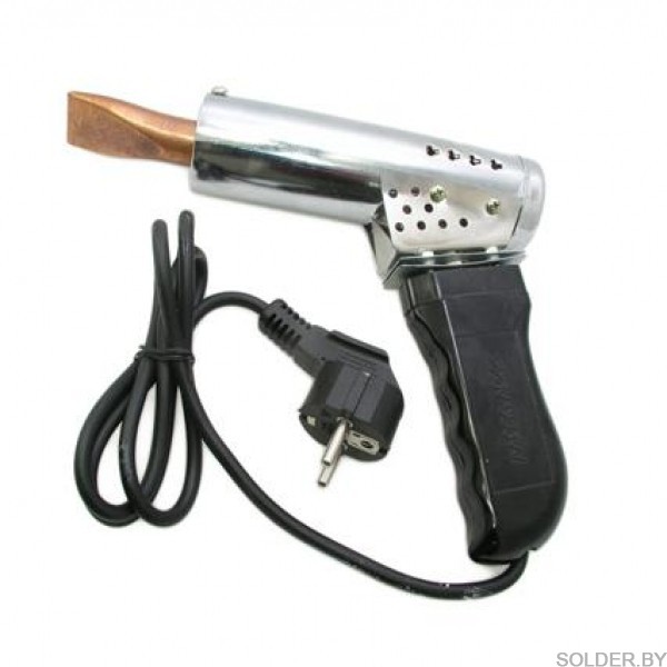 Электрический паяльник ПП 500Вт с пластиковой ручкой, выполненной в виде пистолета непрерывного нагрева предназначен для монтажной пайки и лужения оловянно-свинцовистыми припоями крупных деталей в том числе автомобильных кузовных деталей и радиаторов в производственных и бытовых условиях.