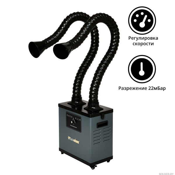 Небольшой и мощный блок со встроенной вытяжкой и трехступенчатой фильтрацией. Дымоуловитель подходит для очистки воздуха от паяльного дыма, дыма и пыли от небольшого лазерного гравера, салонов красоты, косметических лазеров и работы с клеями и растворителями.Дымоуловитель оборудовали простой регулировкой воздушного потока вращающейся рукояткой.Дымоуловитель оснастили колесиками для легкого перемещения и встроенным шумогасителем. Так что пользоваться им будет комфортно и просто. Просто включите его в розетку, подсоедините дымоприемники и включите.