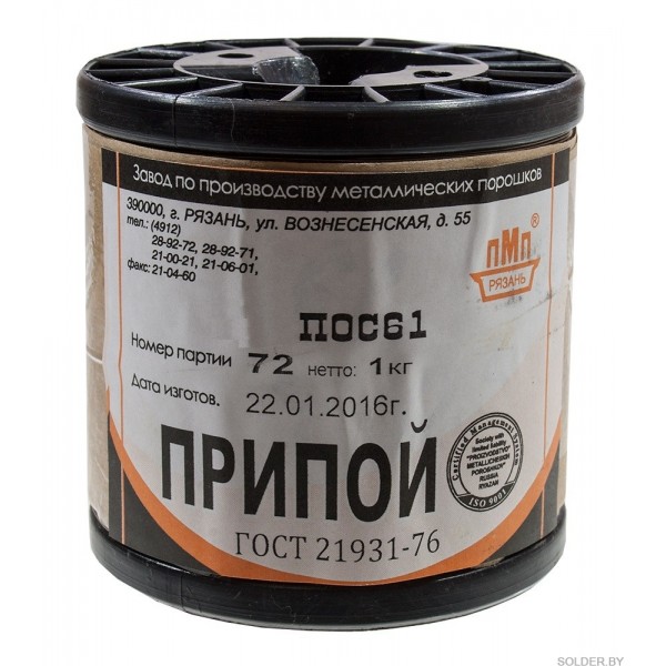 Припой-катушка 500гр. ПОС-61 д.1.0мм без канифоли