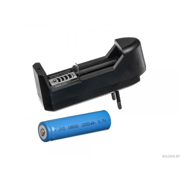 Комплектация: зарядное устройство, аккумулятор 18650 1200 mAh, контейнер для работы от 3 батареек ААА