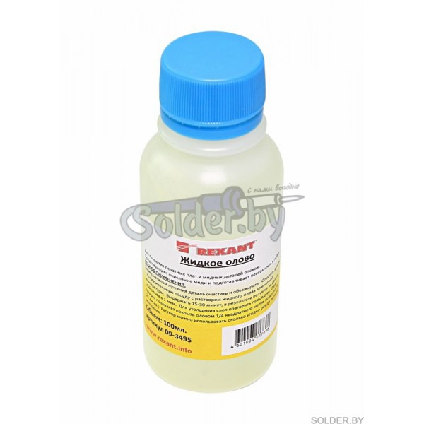 Жидкое олово (химическое лужение плат) 100мл REXANT предназначено для покрытия печатных плат и медных деталей оловом. В результате химического лужения поверхностей и деталей предотвращается окисление меди и поверхность готова к пайке.