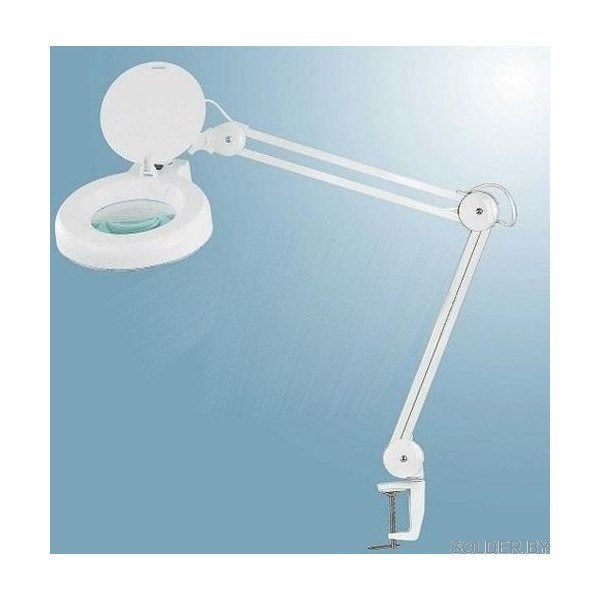 Увеличение лупы: 8Х Диаметр линзы: 5’’ Материал лупы: стекло Номинальная мощность: 22 Вт Тип лампы: кольцевая люминесцентная лампа Освещенность: 1000 Люкс Срок эксплуатации лампы: 5 000 часов Напряжение: 110В-120В 220В-240В Струбцинное крепление к столу Цвет: белый